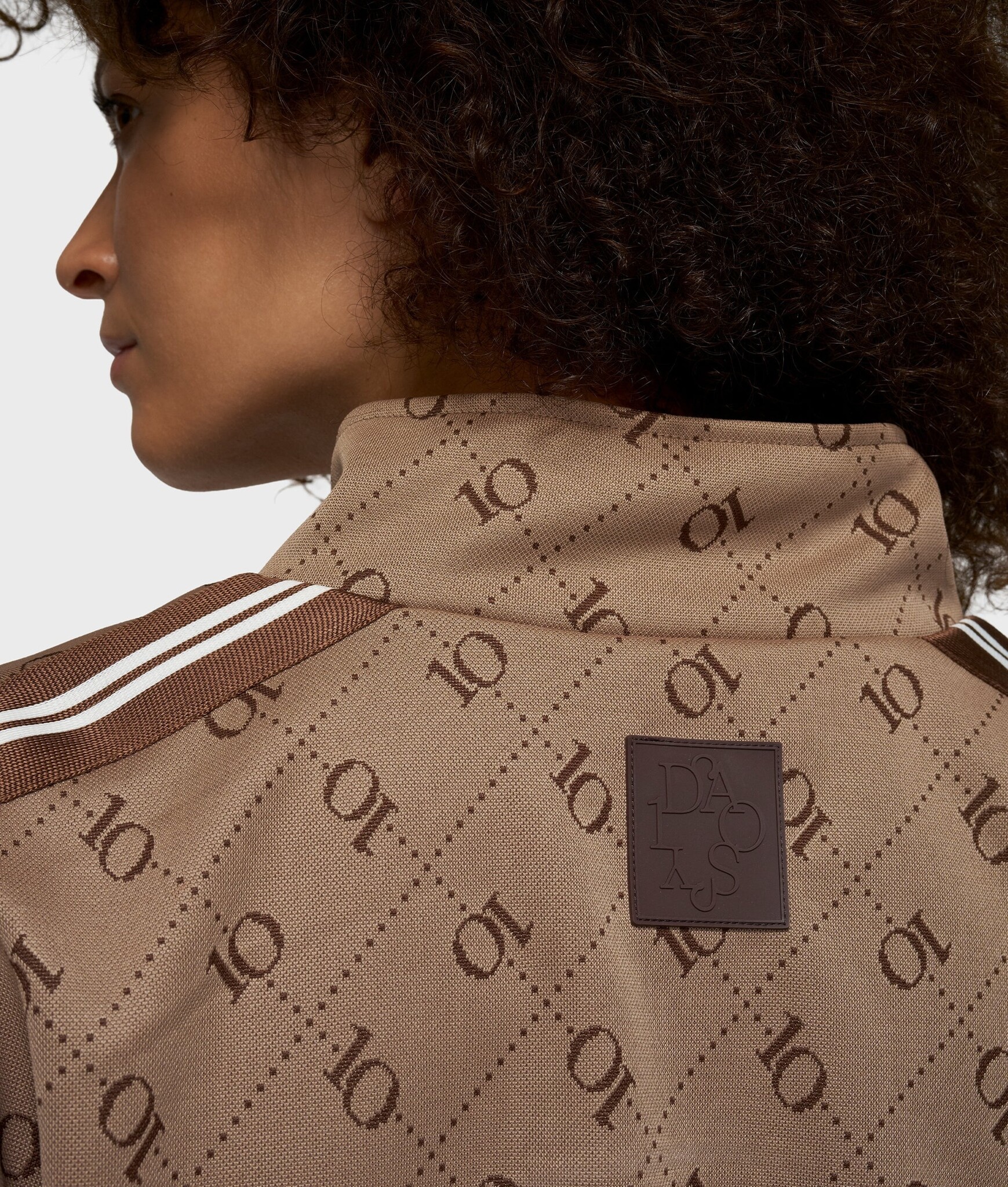 Relaxed fit vest met een '10' monogram print, gemaakt van zacht en soepel jacquard. Het vest heeft een tweewegrits, een hoge kraag, steekzakken, een ballonvormige zoom, tapedetails op de mouwen en een 'curly 10' patch op de rug.