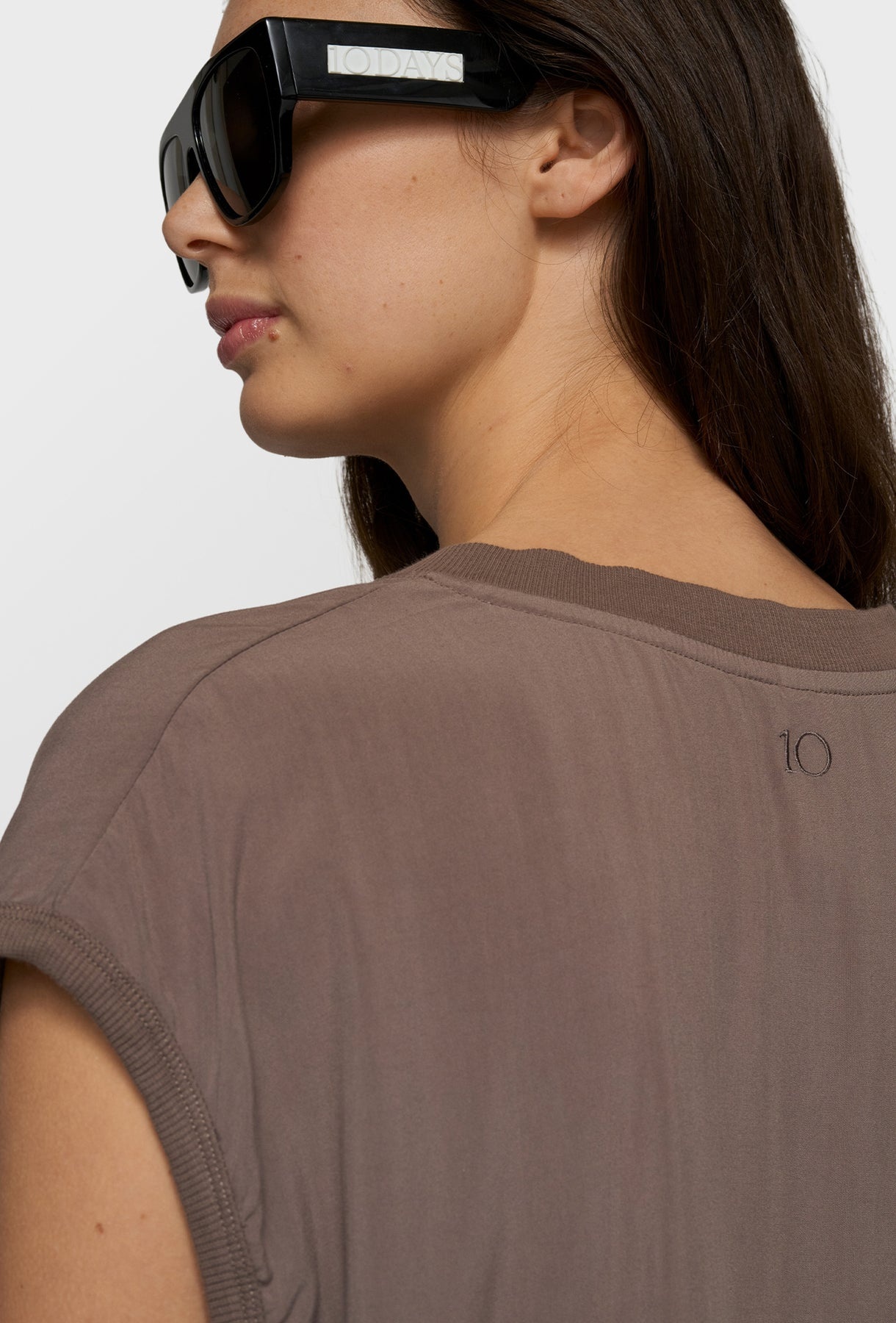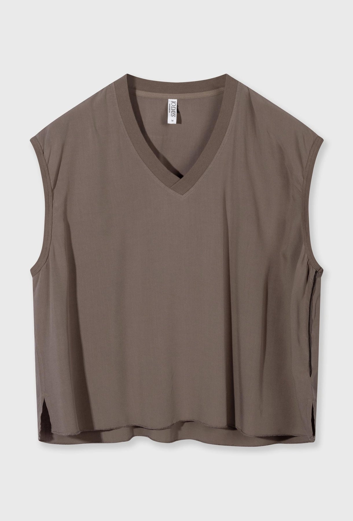 Relaxed fit mouwloze blouse met licht afhangende schouders gemaakt van een lichte, zachte stof. De top heeft een diepe V-hals, afgewerkt met een wijde zoom en splitten aan de zijkant van de zoom.