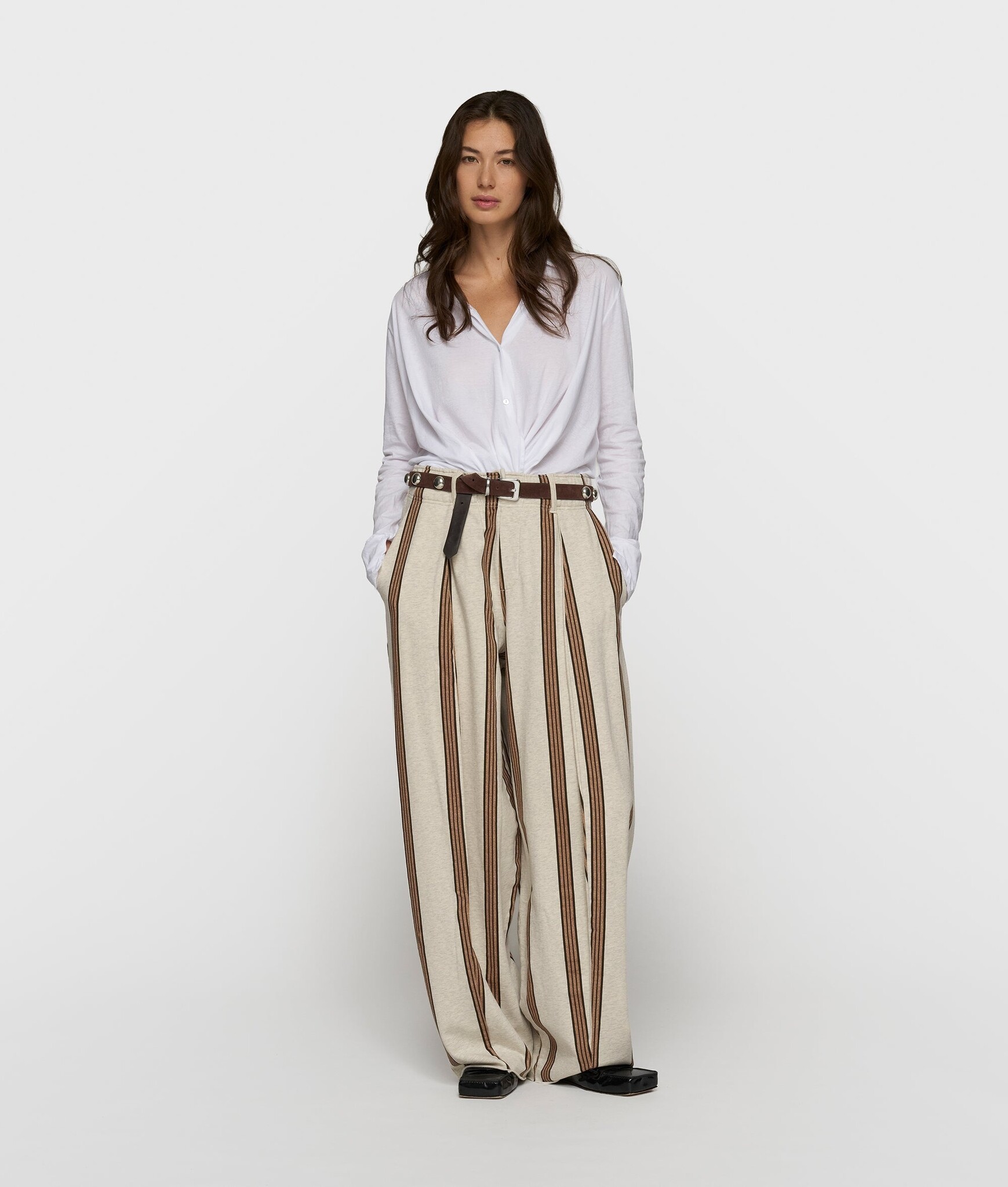 Relaxed fit gestreepte pantalon met wijde geplooide pijpen, gemaakt van biologisch katoenen fleece. De broek heeft een elastische tailleband met een koord en riemlussen, twee schuine steekzakken en twee fake achterzakken met een knoop.